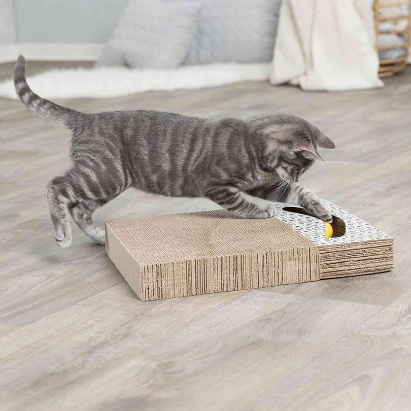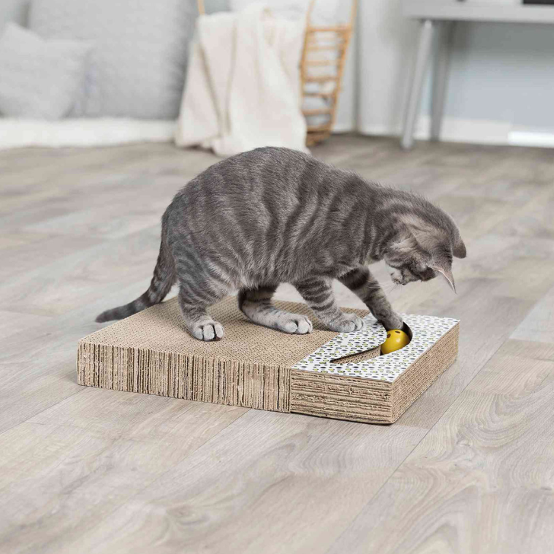 Este rascador de cartón es la opción ideal para quienes buscan una solución práctica y eficaz para satisfacer el instinto natural de arañar de su gato. Fabricado con cartón prensado en capas, proporciona una textura muy atractiva para los felinos y les permite limar sus uñas de forma segura y placentera.