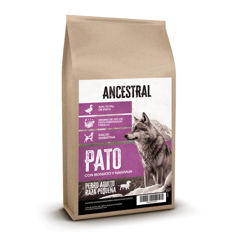 Pato 52% (Incluyendo Pato Preparado Fresco 26%, Pato Deshidratado 24% y Caldo de Pato 2%), Boniato (26%), Guisantes (8%), Patata, Suplementos de Omega 3, Semillas de Lino, Pulpa de Remolacha, Minerales, Naranja (0,3%), Arándanos, Fructooligosacárido (FOS, 96 mg/kg), Mannanoligosacáridos (MOS, 24 mg/kg)