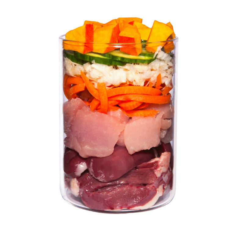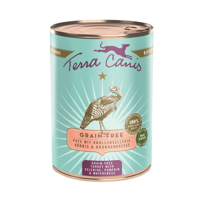 Corazón de pavo (58 %), apio nabo (9 %), zanahoria, calabaza (8 %), carne muscular de pavo (6 %), pepino, harina de coco, aceite de colza, harina de semilla de calabaza, concha de ostra*, levadura de cerveza*, albahaca*, semilla de psyllium*, berros* (0,4 %), manzanilla*, arcilla mineral*, escaramujo*, alga marina*, minerales *seco