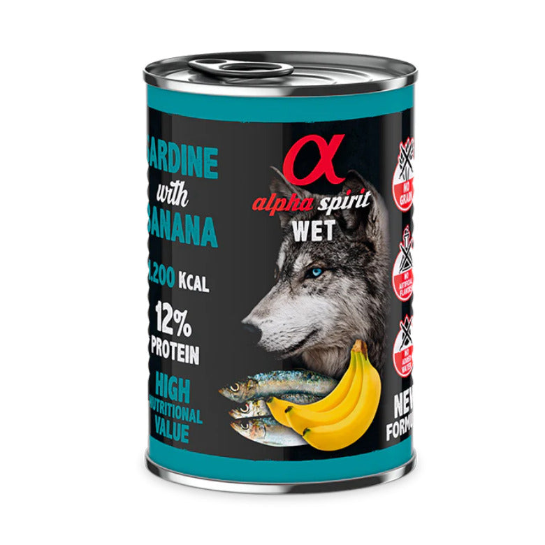 Sardina 93%, plátano 4%, gelatina, pulpa remolacha molida, especias y minerales.
