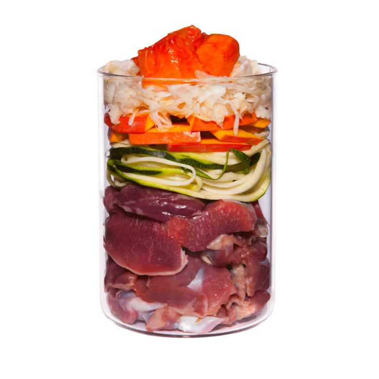 Carne : fruta/verdura/hierbas : demás materias primas = 50 % : 47 % : 3 %