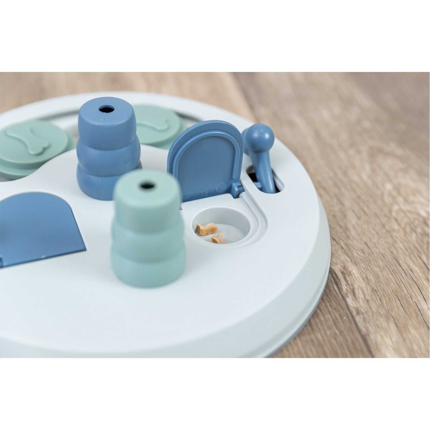 El perro consigue su premio usando diferentes técnicas el tablero tiene 2 conos y hendiduras con tapas con bisagras y deslizantes plástico antideslizante por la base de caucho incluye folleto con consejos y trucos para una educación adecuada