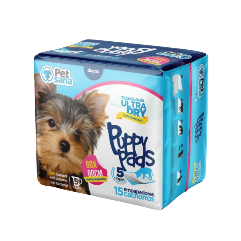 Pack 15 empapadores ultra absorbentes para perros Puppy Pads. 24 h de protección. Tamaño: 60x60cm. Con feromonas atrayentes.