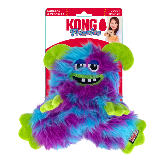 El exuberante y largo pelaje de los KONG Frizzles hace que estos simpáticos diablillos sean irresistibles para los cachorros curiosos que están deseando vivir aventuras en el interior; y son increíblemente suaves para acurrucarse. Estos compañeros peludos satisfacen los instintos de buscar y recoger y de masticar (con suavidad). Los sonidos de chirridos y crujidos mantienen la acción. Perros de todos los tamaños pueden agarrar los cuerpos planos.