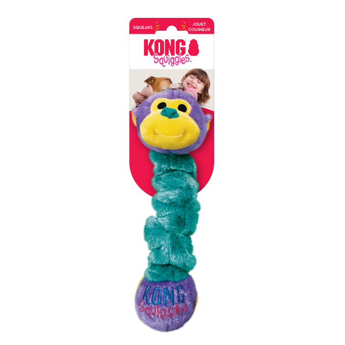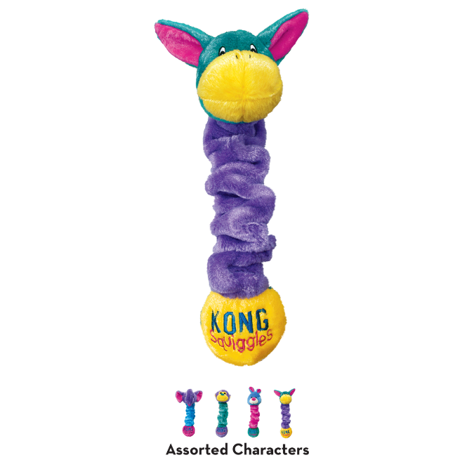 Los KONG Squiggles son juguetes elásticos, flexibles y sonoros que ofrecen diversión para perros. Estos coloridos juguetes vienen en una variedad de cuatro tiernos personajes y cuentan con un cuerpo largo y elástico, además de chirriadores en ambos extremos. Nuestros Squiggles™ están diseñados con muy poco relleno para que su perro pueda divertirse sacudiéndolos y agitándolos sin ensuciar.