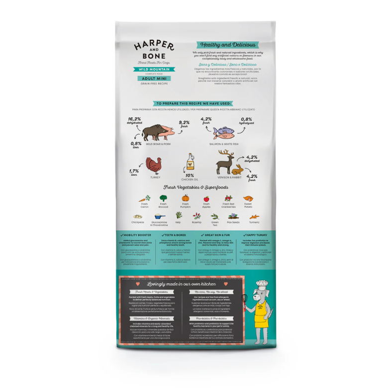 Nuestra receta rebosante de proteínas incluye carne de venado, cerdo ibérico, salmón, conejo y jabalí de la mejor calidad, además de las más deliciosas verduras y frutas enteras y frescas. En la mezcla hemos incorporado algunos de los maravillosos superalimentos que nos brinda la naturaleza, así como probióticos saludables que favorecen la digestión. No solo está llena de vitaminas y minerales esenciales, sino que además contiene condroitina y glucosamina para ayudar al buen estado de huesos y articulaciones. Con esta combinación de perfecto equilibrio nutricional y sabor increíblemente delicioso, ¡tu compañero canino se pondrá a dar saltos de alegría!