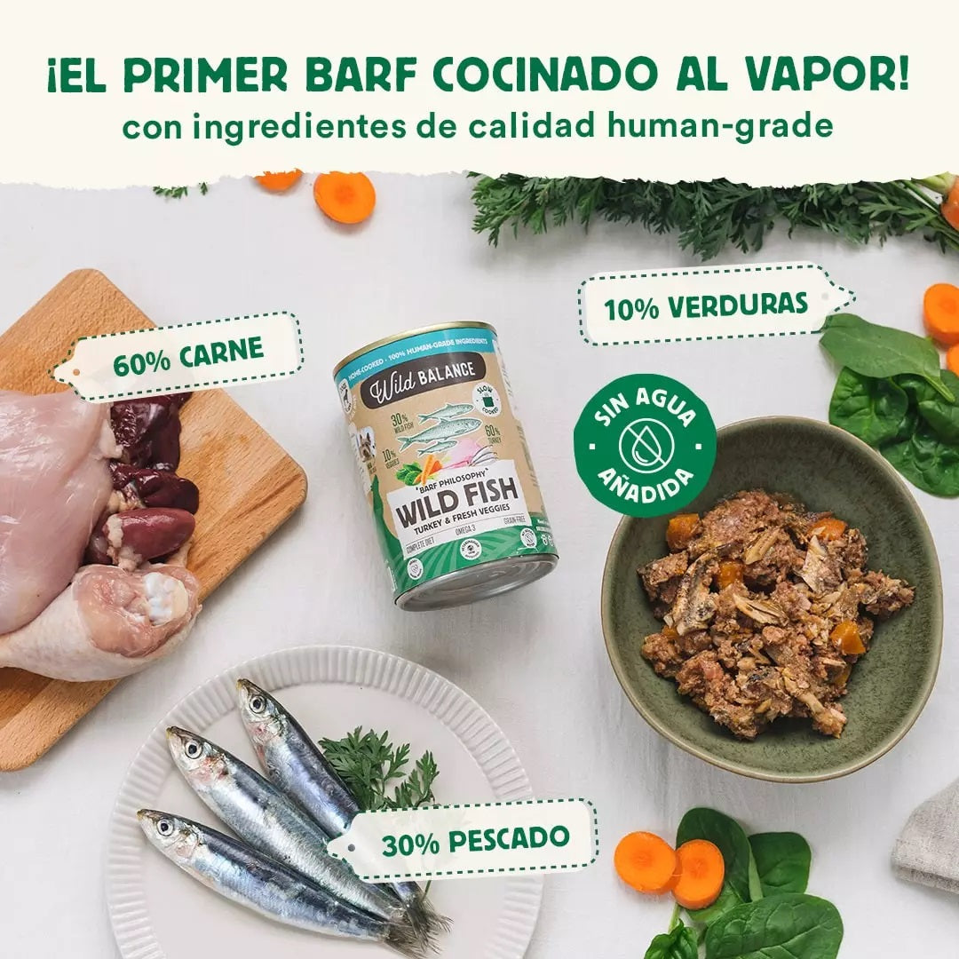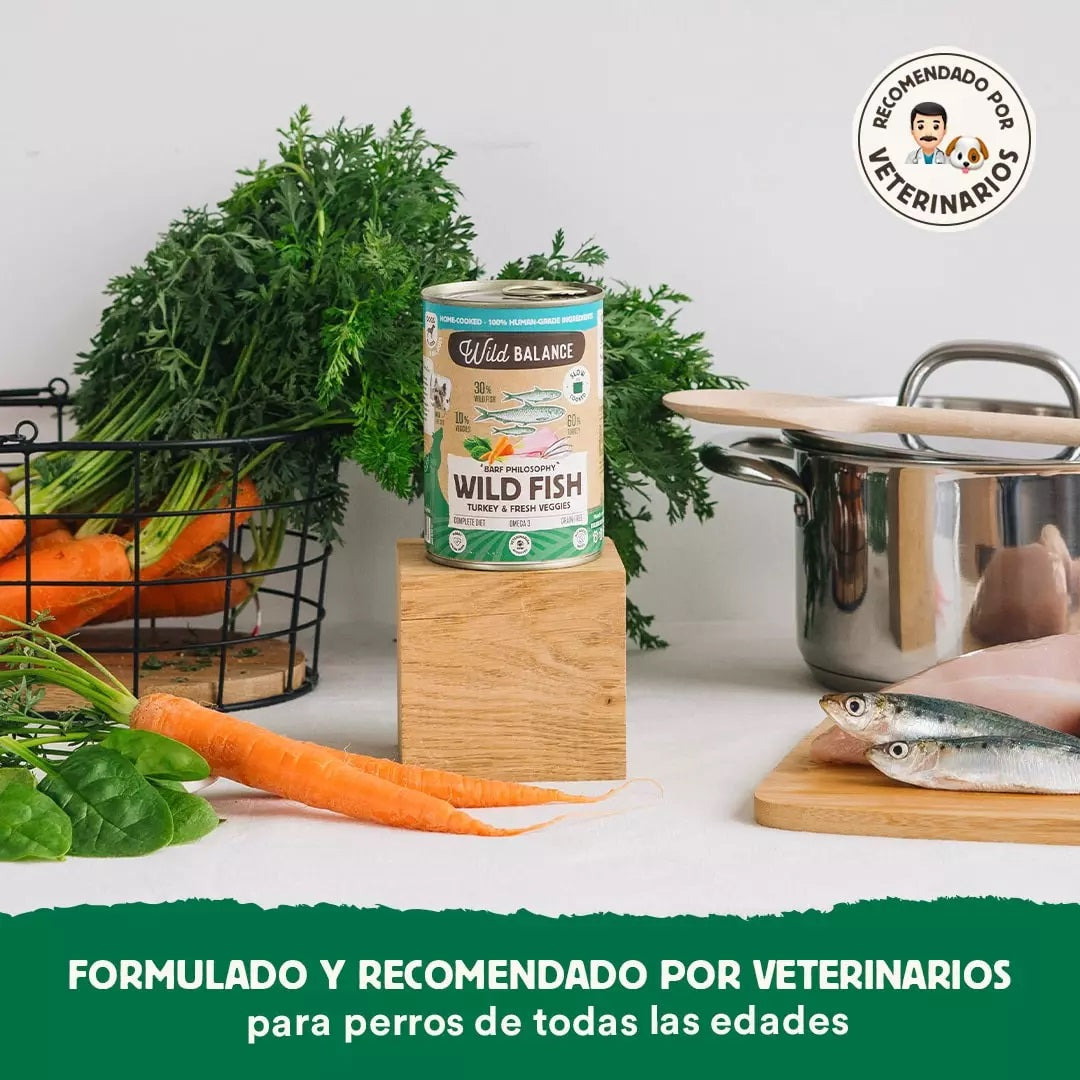 En Wild Balance somos conscientes de la importancia que tiene la alimentación para nuestros perros, por ello todas nuestras latas contienen ingredientes de calidad, con un alto porcentaje de carne, pescado y verduras (60% pavo, 30% espadín, 10% zanahoria y espinacas). Cocinados a fuego lento y con mucho amor.