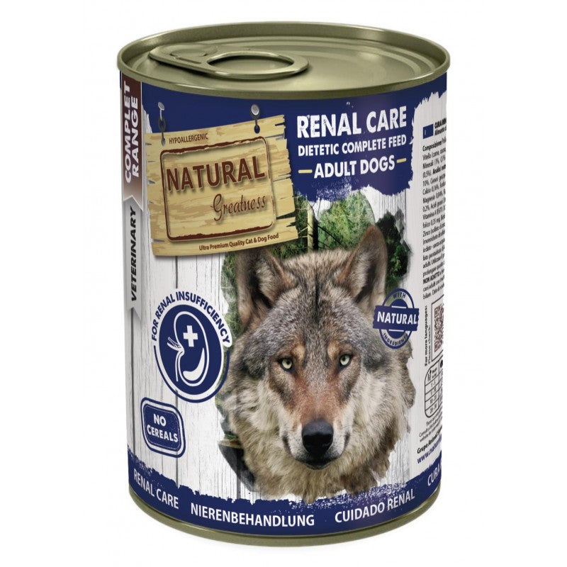 Natural Greatness Renal Care is a complete, hypoallergenic, grain-free wet food formulated for junior and adult dogs of all breeds with chronic kidney failure who require a diet based on restricted protein and phosphorus intake. Renal Care contributes to the preservation of kidney function and the reduction of the recurrence of oxalate stones. This food is not recommended for pregnant or nursing dogs, puppies, and dogs with liver failure caused by bile secretion. It is recommended to use this food for 6 months. After this period and after evaluation, extend the diet if necessary.
