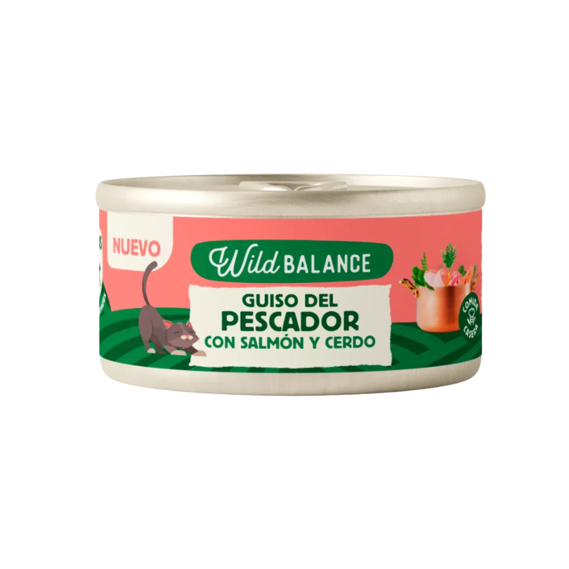 Canned homemade cooked fisherman's stew cat food with salmon, pork, and vegetables. It features the delicious and intense flavor of pork combined with the juiciness of salmon in a balanced recipe packed with Omega 3, minerals, B vitamins, essential amino acids, and protein .