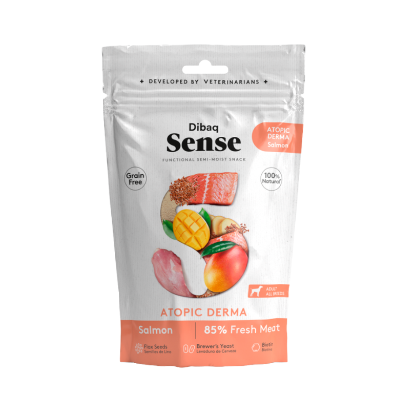 Dibaq Sense Atopic Derma Salmon Snack is a snack made with fresh salmon and turkey meat, potatoes, fresh mango, potatoes, flax seeds, brewer's yeast, and biotin. Natural ingredients that help maintain healthy skin and coat.