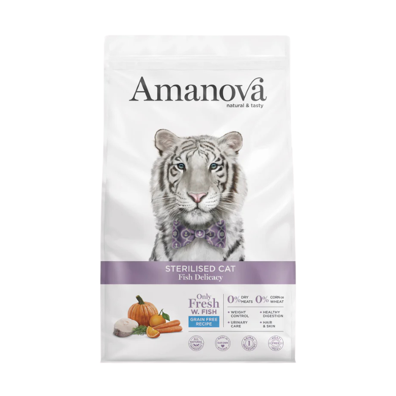 Amanova Sterilised Fish Delicacy es una receta exclusiva de comida natural para gatos esterilizados, sin harinas de carne ni carnes deshidratadas, contiene fibras dietéticas e ingredientes especiales como probióticos, calabaza, jengibre y aceites de pescado, que ayudará a mejorar la función renal, la digestión y a prevenir la formación de bolas de pelo.