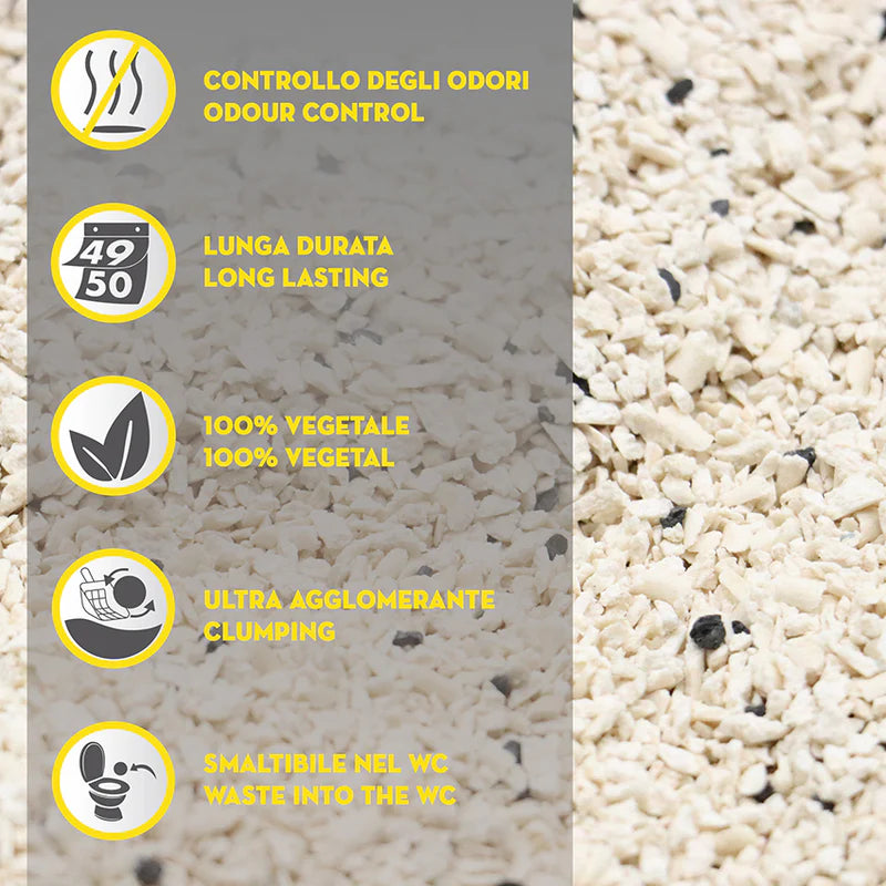 Arena aglomerante para gatos, 100% biodegradable y por tanto de fácil eliminación gracias a la acción aglomerante de las fibras vegetales que la componen que retienen los líquidos del gato creando una bola compacta que garantiza la máxima absorción. Se trata de una arena de fácil eliminación que se puede desechar en el inodoro o en el compost casero o como fertilizante en la huerta o jardín.