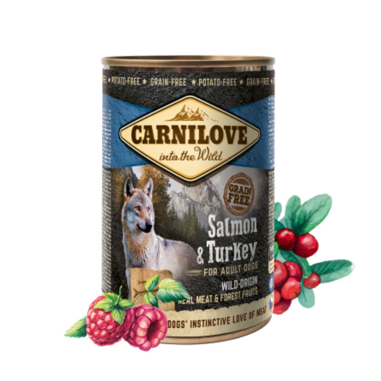 pavo (47%), salmón (20%), arándanos (2%), arándanos rojos (2%), frambuesas (2%), harina de guisantes (2%), lignocelulosa (1%), aceite de salmón (1%).