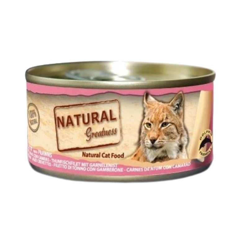 Natural Greatness FILETE DE ATÚN CON GAMBAS es una excelente receta húmeda complementaria, ultra premium e hipoalergénica, desarrollada idealmente como premio o recompensa a gatos adultos. Este alimento natural a base de ricos filetes de atún troceados y gambas de alta calidad contiene únicamente los ingredientes listados, sin aditivos, derivados animales, subproductos o rellenos.
