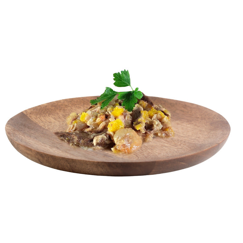 Composición: Filete de atún (55%), Caldo de pescado (23%), Gambas (10%), Calabaza (10%), Arroz (1%), Maltodextrina (1%).