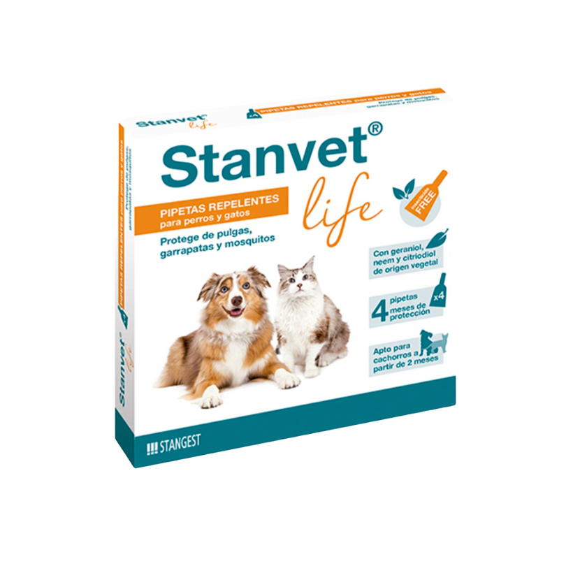 Stanvet Life es una nueva gama de repelentes de mosquitos, pulgas y garrapatas. Tiene una fórmula exclusiva con 4 extractos de origen vegetal, que respetan la salud de la mascota. Gracias a su composición, puede utilizarse en cachorros a partir de 2 meses o 0.8 kg, perros con pieles sensibles o alergias, perros de edad avanzada, entornos con niños, etc.