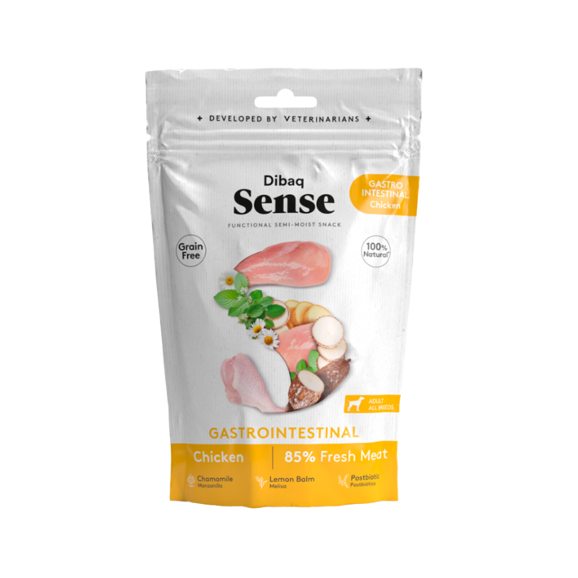 Dibaq Sense Snack Gastrointestinal es un Snack semi húmedo elaborado con carne fresca pollo, patata, mantanilla, melisa y yuca. Ingredientes naturales pensados para digestiones difíciles ya que ayudan a facilitar la digestión y prevenir problemas gastrointestinales.