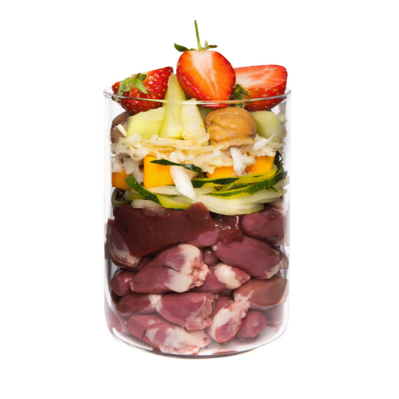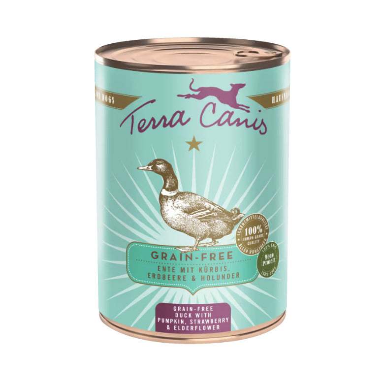 Corazón de pato (50 %), calabaza (12 %), zanahoria, higado de pato (6 %), calabacina, apio (5 %), melón, manzana, castaña (1,5 %), fresa (1 %), aceite de colza, concha de ostra*, levadura de cerveza*, flor de sauco* (0,4 %), semilla de psyllium*, perifollo*, diente de león*, arcilla mineral*, perejil*, sal de los Andes, algas marinas*, minerales*seco