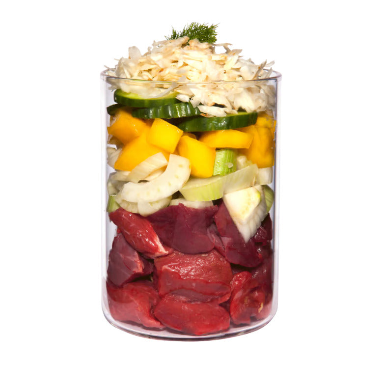 Corazon de buey (27 %), pulmon de buey (23 %), calabaza (19 %), pepino, hinojo, chirivias*, mango (4 %), harina de coco, harina de semilla de calabaza, semilla de psyllium, aceite de colza, levadura de cerveza*, concha de ostra*, hoja de alcachofa* (0,3 %), escaramujo*, remolacha*, diente de leon*, albahaca*, arcilla mineral*, alga marina*, minerales *seco