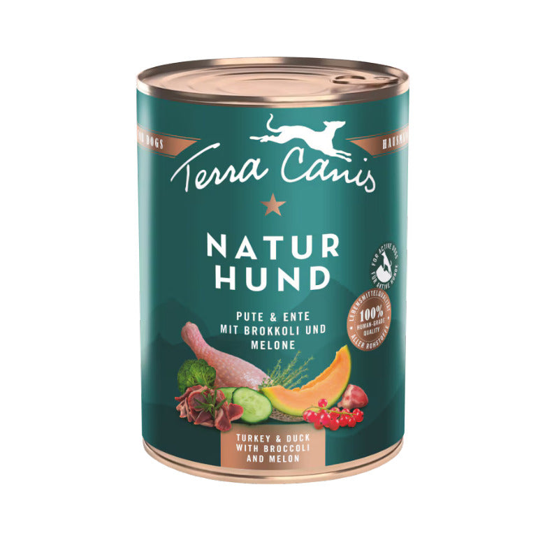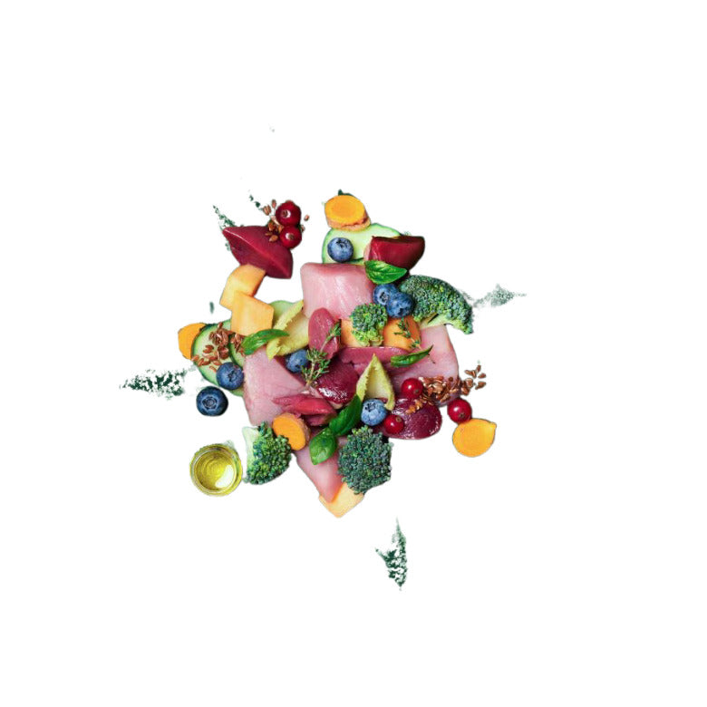 Molleja de pavo (21 %), corazón de pavo (14 %), piel de pavo (11 %), zanahoria, molleja de pato (7 %), hígado de pavo (6 %), carne muscular de pavo (6 %), pepino (5,9 %), brécol (4 %), melón (4 %), aceite de colza, arándano (2 %), grosella roja (2 %), aceite de pescado, harina de coco, semillas de lino, ß-glucanos, raíz de achicoria*, levadura de cerveza*, cúrcuma* (0,1 %), L-carnitina, albahaca*, romero* (0,1 %), tomillo* (0,1 %), concha de ostra*, arcilla mineral, espirulina*, minerales*. *secado