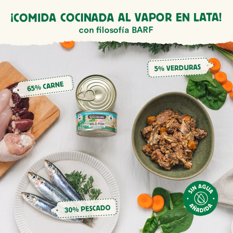 INGREDIENTES: 50% Pavo (35% pavo entero, 10% hígado de pavo, 5% corazón de pavo), 45% Pescaditos salvajes (espadín), 3% Zanahoria y 2% Espinaca.