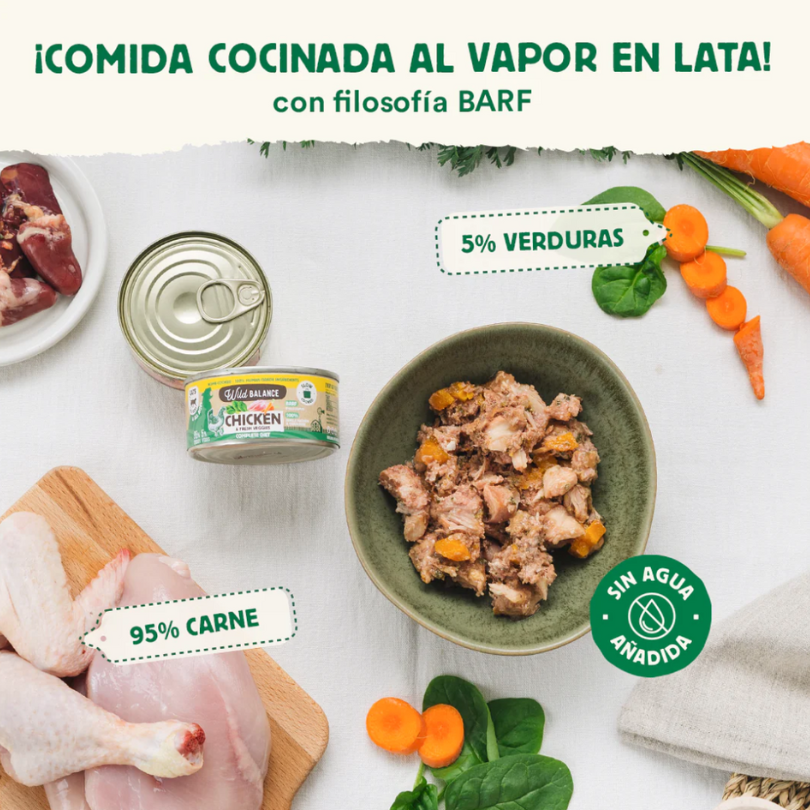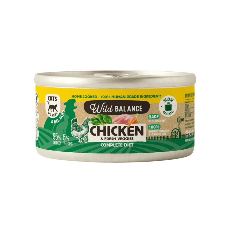 Lata de comida cocinada para gatos de pollo con verduras frescas, perfecta para gatos con problemas digestivos. La carne de pollo es muy ligera y con bajo contenido en grasas y calorías, por lo que es muy adecuada para controlar el peso. Rica en vitaminas del grupo B y en proteínas de alto valor biológico.