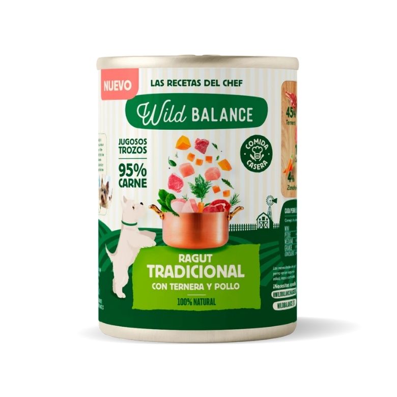 En Wild Balance somos conscientes de la importancia que tiene la alimentación para nuestros perros, por ello todas nuestras latas contienen ingredientes de calidad, con un alto porcentaje de carne y verduras (45% ternera, 40% pollo, 10% cerdo, 4% zanahoria y 1% calabaza). Cocinados a fuego lento y con mucho amor.